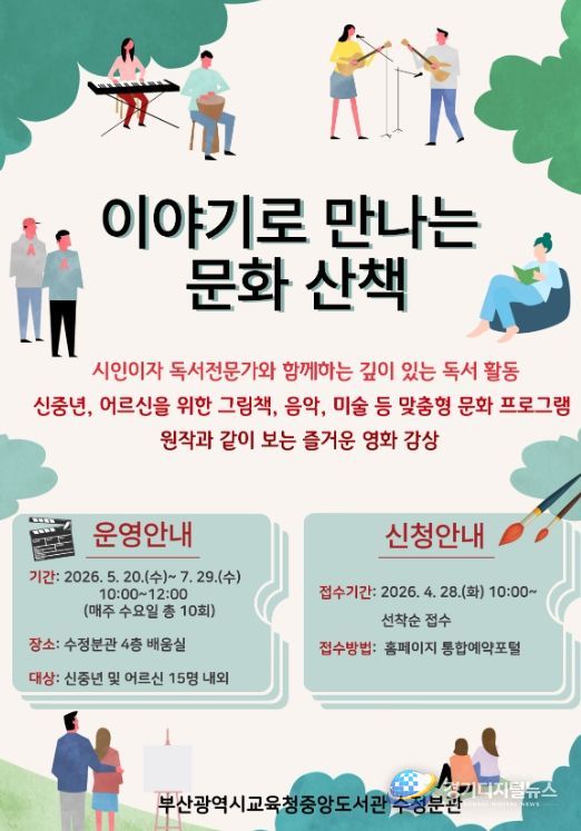 경기디지털뉴스 마성숙 기자 | 부산광역시립중앙도서관은 오는 5월 20일부터 7월 29일까지 매주 수요일마다 중앙도서관 수정분관에서 신중년 및 어르신 15명을 대상으로 ‘이야기로 만나는 문화 산책’ 프로그램을 운영한다.