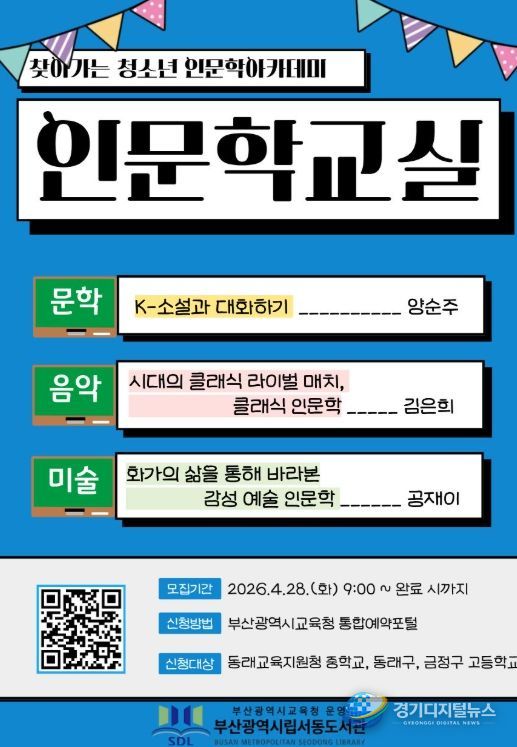 경기디지털뉴스 마성숙 기자 | 부산광역시교육청서동도서관은 오는 5월부터 11월까지 동래교육지원청 관내 중학교와 고등학교(동래구, 금정구)를 대상으로 ‘찾아가는 청소년 인문학 아카데미’를 진행한다.