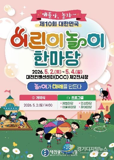 경기디지털뉴스 마성숙 기자 | 대전시교육청은 제104회 어린이날을 맞아 오는 5월 2일부터 4일까지 3일간 대전컨벤션센터(DCC) 제2전시장에서 ‘제10회 대한민국 어린이 놀이 한마당’을 개최한다고 밝혔다.