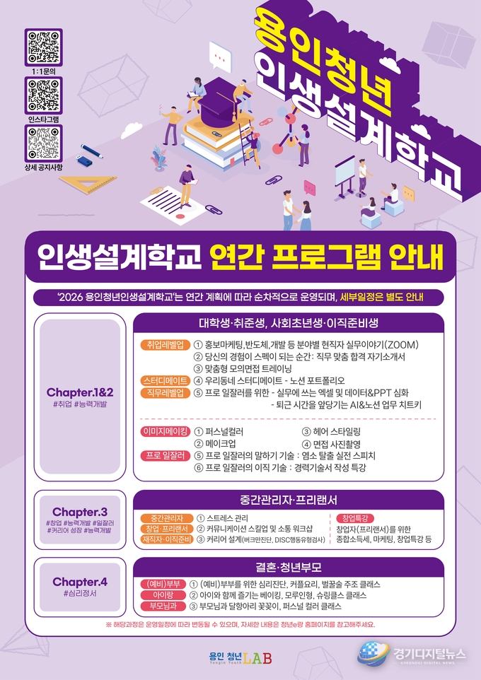 ‘용인청년 인생설계학교’는 취업 준비 단계부터 사회초년생, 중간관리자, 프리랜서, 예비부부, 청년 부모에 이르기까지 청년의 생애주기 전반을 아우르는 통합형 교육 프로그램이다. 단계별 맞춤형 교육을 통해 청년들이 각자의 상황에 맞는 성장을 설계할 수 있도록 지원하는 것이 특징이다.