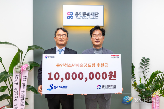 재단은 지난 23일 경수고속도로(주)로부터 청소년 예술 장학사업 ‘용인청소년예술꿈드림’을 위한 기부금 1,000만 원을 기탁받았다고 밝혔다. 이번 후원금은 용인서울고속도로 이용 차량 1대당 1원씩 적립한 금액과 사회공헌 예산을 더해 마련된 것으로, 기업의 사회적 책임 실천과 지역사회 환원의 의미를 담고 있다.
