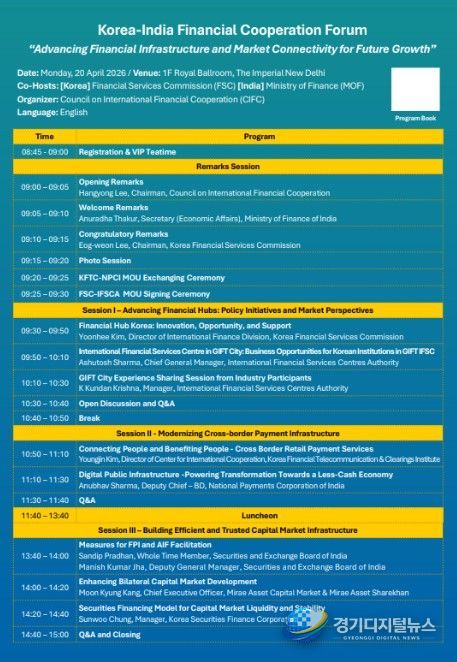 경기디지털뉴스 마성숙 기자 | 금융위원회 이억원 위원장은 4월 19일~25일 4박 7일 일정으로 대통령의 인도·베트남 해외순방에 동행했다. 주요 일정으로는 한국 금융회사 해외진출 및 영업 확대 지원을 위한 고위급 정부회담, 금융중심지 육성 및 국경간 QR 결제망 연동 등을 위한 금융협력포럼 개최, 현지 금융회사·기업 간담회 등을 진행했다. 이번 방문은 고속 성장 중인 두 핵심 파트너 국가와의 ‘전략적 협력 고도화’라는 목표를 금융분야에서 적극 뒷받침하기 위해 마련된 것으로, 인도의 경우 금융위원장으로서는 첫 방문이다.