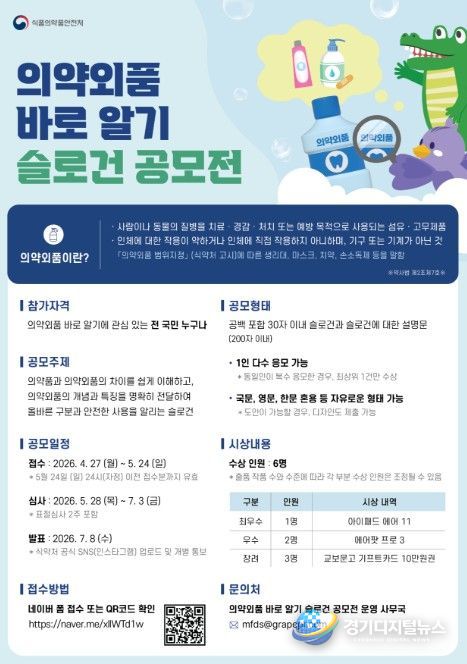 경기디지털뉴스 마성숙 기자 | 식품의약품안전처는 의약외품을 의약품과 구분하여 올바르게 사용할 수 있도록 ‘의약외품 바로알기 슬로건’ 공모전을 4월 27일부터 5월 24일까지 개최한다고 밝혔다.