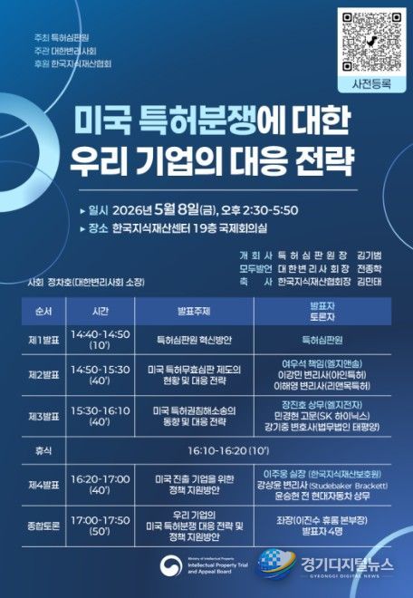 경기디지털뉴스 마성숙 기자 | 지식재산처 특허심판원은 5월 8일 14시 30분 한국지식재산센터(서울 강남구)에서 우리 기업의 미국 특허분쟁 대응 역량 강화를 위해 '미국 특허분쟁에 대한 우리 기업의 대응전략' 발표회를 개최한다고 밝혔다.