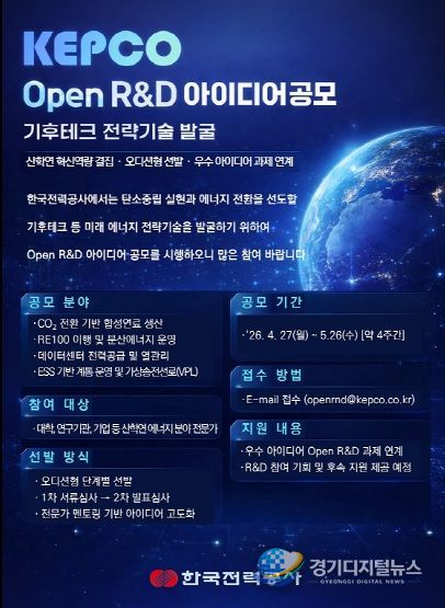경기디지털뉴스 마성숙 기자 | 한국전력이 기후테크 등 미래 에너지 전략기술 확보를 위해 산·학·연 혁신 아이디어를 발굴하는 'Open R&D 아이디어 공모'를 추진한다.