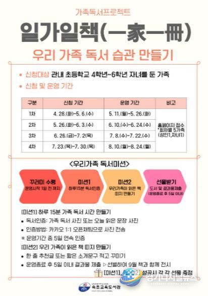 참여 가족에게는 선정도서와 독서대, 모래시계 등이 포함된 ‘일가일책 꾸러미’를 제공하며, 매일 15분 독서 인증과 독후활동(책 띠지 만들기) 미션을 수행하도록 지원한다.