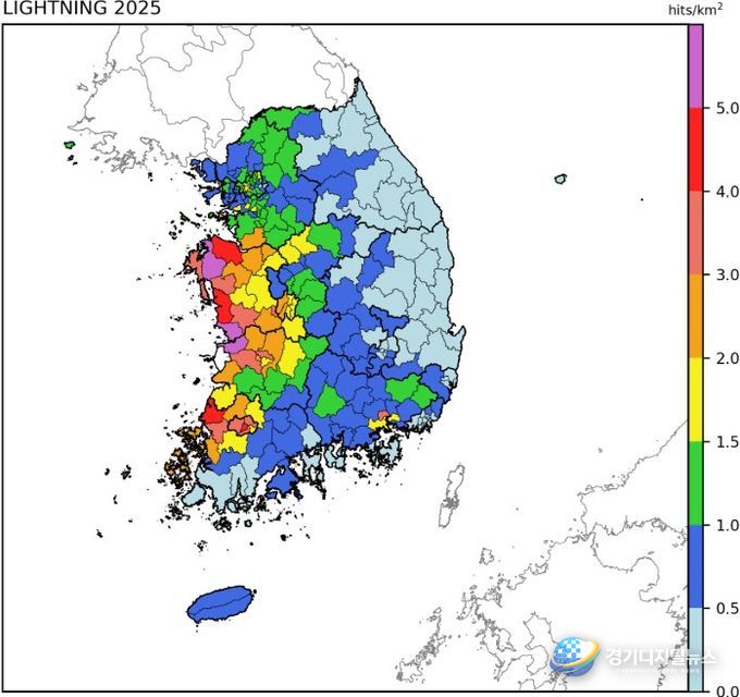 경기디지털뉴스 마성숙 기자 | 기상청은 2025년 우리나라에서 관측된 낙뢰 정보를 담은 ‘2025 낙뢰연보’를 발간했다. 연보는 기상청 21개 낙뢰 관측망으로 관측한 자료를 통해 분석한 △월별, 광역시·도별, 시군구별 낙뢰 횟수 △단위 면적당(㎢) 횟수 △낙뢰 공간 분포 △주요 5대 낙뢰 사례 등의 내용을 담고 있다.