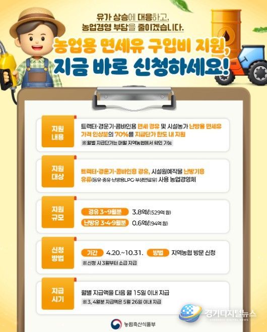 경기디지털뉴스 마성숙 기자 | 농림축산식품부는 올해 추경예산에 반영된 농기계 3종 면세경유 유가연동보조금과 시설농가 난방용 면세유 유가연동보조금 지원 신청·접수중(4월 20일~10월 31일)에 있다고 밝혔다.