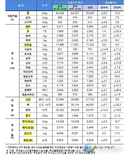 경기디지털뉴스 마성숙 기자 | 농림축산식품부는 4월 5주 수급동향 점검 결과, 지난주와 특별한 변동 없이 농산물 가격은 전반적으로 전년 대비 낮은 수준을 유지하고 있는 것으로 나타났다고 밝혔다.