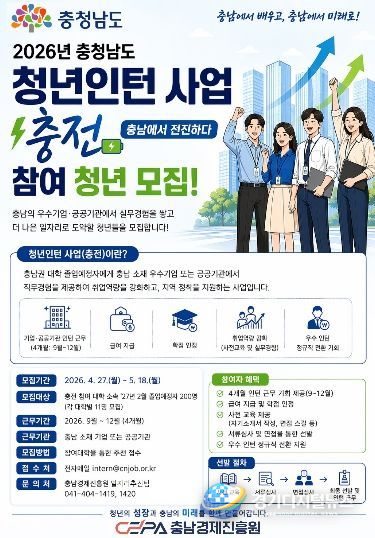 경기디지털뉴스 마성숙 기자 | 충남도는 도내 청년들의 실질적인 직무 경험과 취업 경쟁력을 높이기 위해 ‘2026년 충청남도 청년인턴 사업(충전: 충남에서 전진하다)’ 참여 청년을 모집한다고 28일 밝혔다.