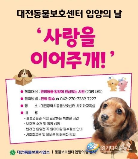 경기디지털뉴스 마성숙 기자 | 대전동물보호사업소는 5월 16일 ‘사랑을 이어주개’를 주제로 시민과 보호동물이 함께하는 ‘유기동물 입양의 날’ 행사를 개최한다.