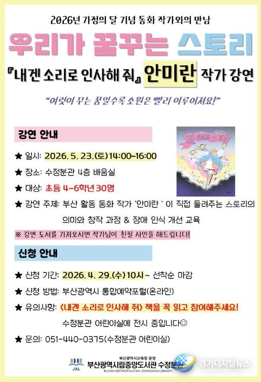 경기디지털뉴스 마성숙 기자 | 부산광역시립중앙도서관은 다음달 23일 중앙도서관 수정분관에서 초등학생 4~6학년 30명을 대상으로 가정의달 기념 안미란 동화 작가와의 만남 ‘우리가 꿈꾸는 스토리’를 운영한다.