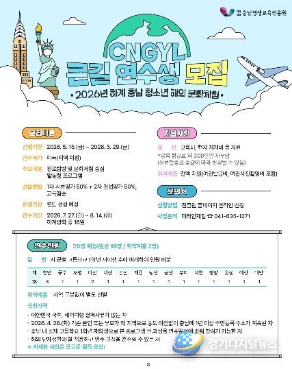 경기디지털뉴스 마성숙 기자 | (재)충남평생교육진흥원은 도내 청소년들이 미국 현지에서 다양한 문화를 체험하고 자신의 진로를 탐색할 수 있도록'2026년 충남 청소년 해외 문화체험 큰길(CNGYL) 프로그램'하계 연수생을 모집한다.