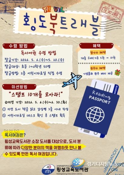경기디지털뉴스 마성숙 기자 | 횡성교육도서관은 5월 6일부터 6월 30일까지 어린이들의 자발적인 독서 습관 형성과 도서관 이용 활성화를 위해 독서 여권을 활용한 ‘횡도북트래블’ 프로그램을 운영한다고 밝혔다.