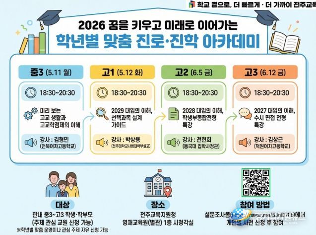 전주교육지원청은 오는 5월 11일부터 6월 12일까지 전주교육지원청 영재교육원 시청각실에서 중3~고3 학생과 학부모를 대상으로 ‘2026년 꿈을 키우고 미래로 이어가는 학년별 맞춤 진로·진학 아카데미’를 운영한다고 28일 밝혔다.
