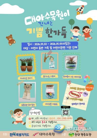 경기디지털뉴스 마성숙 기자 | 전북특별자치도는 대아수목원이 제104회 어린이날을 맞아 5월 2일부터 5일까지 어린이와 가족이 함께 즐길 수 있는 특별행사를 운영한다고 28일 밝혔다.