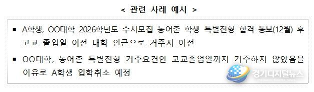 경기디지털뉴스 마성숙 기자 | 교육부는 ‘농어촌 학생 특별전형’ 자격요건과 관련하여 대입현장에서 반복적으로 발생하는 불합리한 사례를 해소하기 위한 적극행정조치 및 제도개선을 시행할 계획이라고 밝혔다.