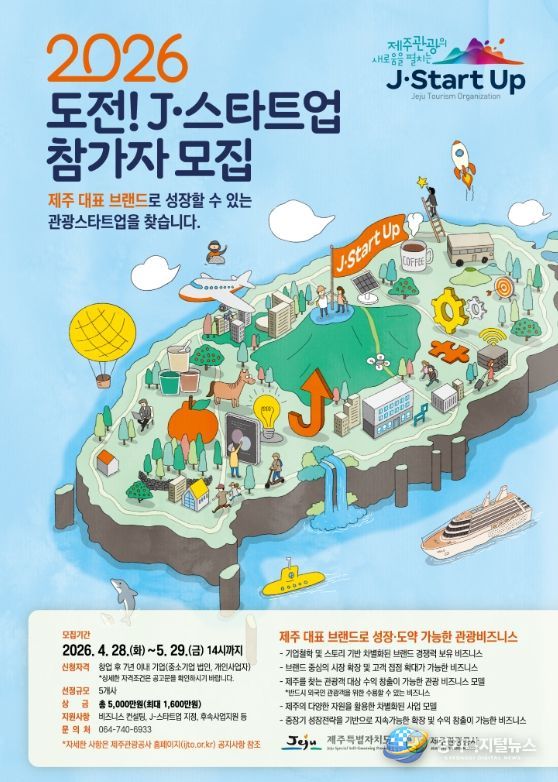 경기디지털뉴스 마성숙 기자 | 제주특별자치도와 제주관광공사(사장 고승철)는 오는 5월 29일까지 온라인 채널을 통해 제주 관광산업 혁신을 선도할 유망 기업을 발굴하고 육성하기 위해 ‘2026 도전! J-스타트업’ 참가기업을 모집하고 있다고 28일 밝혔다.