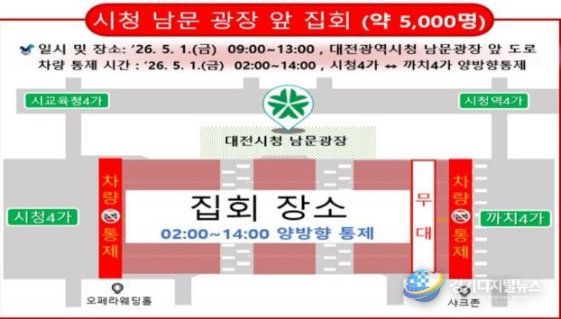 이번 집회는 5월 1일 오전 9시부터 오후 1시까지 대전시청 남문광장 일원에서 개최되며, 행사 준비와 안전 확보를 위해 오전 2시부터 주변 도로가 단계적으로 통제된다.