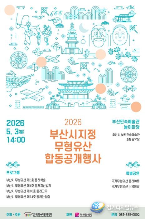 경기디지털뉴스 마성숙 기자 | 부산시는 오는 5월 3일 오후 2시 부산시 무형유산 전수교육관인 '부산민속예술관 놀이마당'에서 무형유산의 보존과 원형 전승을 위한 '2026 부산광역시 지정 무형유산 합동 공개행사'를 개최한다고 밝혔다.