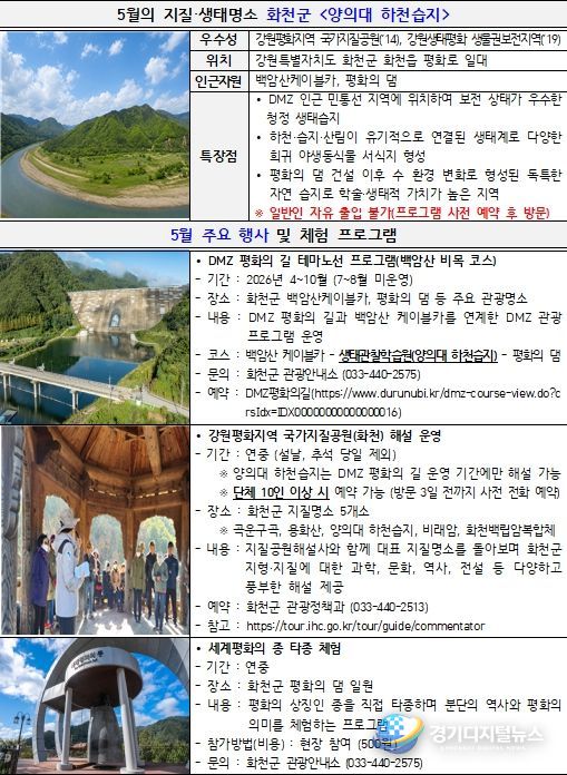 강원특별자치도 관계자는 “화천 양의대 하천습지는 디엠지(DMZ) 인근의 청정 자연환경과 생태적 가치를 동시에 갖춘 소중한 자원”이라며, “5월의 싱그러운 자연 속에서 생태와 평화가 어우러진 특별한 여행을 경험하시길 바란다”고 말했다.