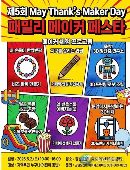경기디지털뉴스 마성숙 기자 | 강원도립대학교는 5월 가정의 달을 맞아 가족 참여형 체험 행사인 ‘패밀리 메이커 페스타’를 오는 5월 2일 교내 이노베이션센터에서 개최한다.