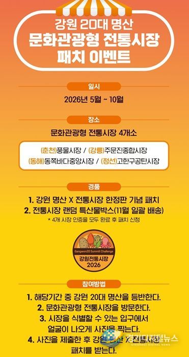 경기디지털뉴스 마성숙 기자 | 강원관광재단, 강원지방중소벤처기업청, 소상공인시장진흥공단 강원지역본부은 ‘강원 20대 명산 인증챌린지’와 전통시장을 연계한 다양한 이벤트를 5월부터 10월까지 추진한다.