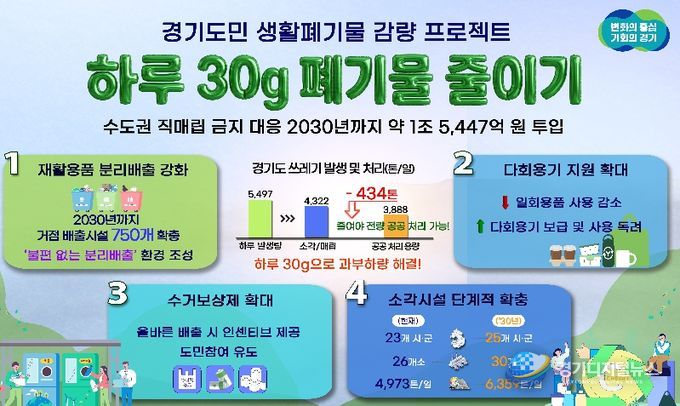 경기디지털뉴스 마성숙 기자 | 수도권 직매립 금지에 따른 생활쓰레기 감량을 위해 경기도가 2030년까지 5년간 약 1조 5,447억 원을 투입하는 ‘하루 30g, 도민실천형 생활폐기물 감량 프로젝트’를 추진한다.