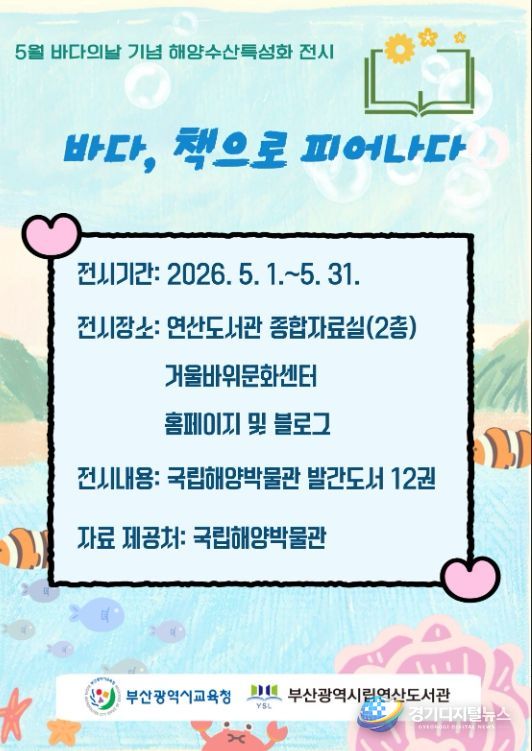 경기디지털뉴스 마성숙 기자 | 부산광역시립연산도서관은 바다의 날(5월 31일)을 기념해 5월 한 달간 지역주민과 도서관 이용자를 대상으로 해양·수산 특성화 전시 ‘바다, 책으로 피어나다’를 운영한다.