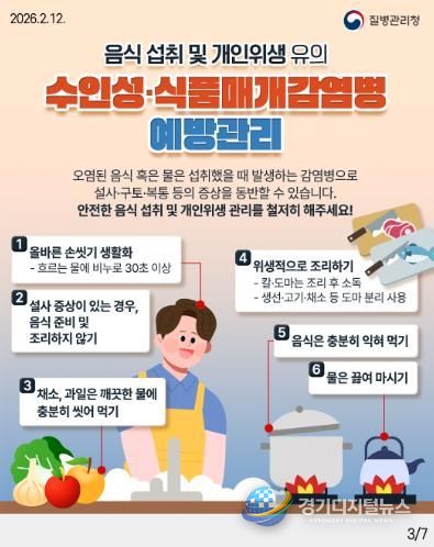 주요 예방수칙은 ▲흐르는 물에 30초 이상 손 씻기 ▲음식물 충분히 익혀 먹기 ▲물 끓여 마시기 ▲채소·과일은 깨끗한 물에 씻어 먹기 ▲설사 증상이 있는 경우 음식 조리하지 않기 등이다.