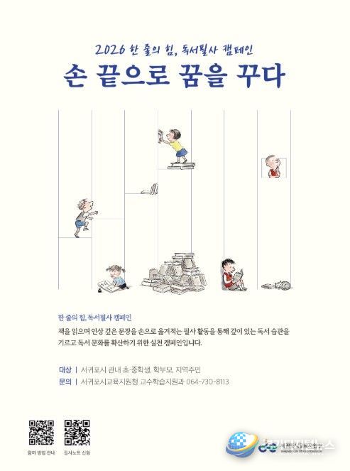 경기디지털뉴스 마성숙 기자 | 서귀포시교육지원청은 학생과 보호자 그리고 교원 등 교육공동체가 함께 참여하는 ‘2026 한 줄의 힘, 독서필사 캠페인’을 운영하며 일상 속 독서문화 확산에 힘쓰고 있다.