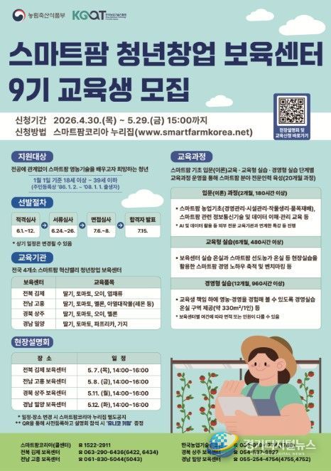 경기디지털뉴스 마성숙 기자 | 농림축산식품부는 4월 30일부터'스마트팜 청년창업 보육센터'의 2026년 신규 교육생을 모집한다.