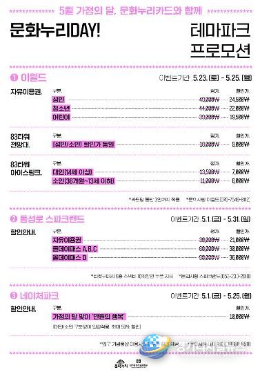 상세한 할인율과 이용방법은 각 테마파크 문의처를 통해 확인할 수 있다.