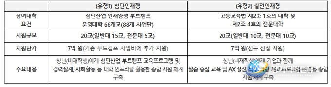 지원 대상은 준비중 청년 등 19세 이상 34세 이하의 비재학생 청년이다. 이번 사업은 청년의 다양한 역량 수요와 진로 수요를 반영하여 ‘첨단인재형’과 ‘실전인재형’의 두 가지 유형으로 운영된다. 첨단인재형은 기존 첨단산업 인재양성 부트캠프 운영 기반을 활용하여 첨단분야 중심의 교육과 취업 지원을 제공하는 유형이며, 실전인재형은 인문·사회·예술·서비스 등 다양한 분야에서 기업과 함께 직무 중심의 인공지능 전환(AX, AI Transformation) 교육과정을 운영하는 유형이다.