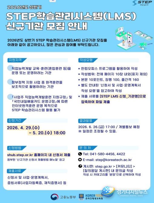 경기디지털뉴스 마성숙 기자 | 한국기술교육대학교 온라인평생교육원(원장 한연희)은 고용노동부와 함께 2026년도 상반기 스텝(STEP) 학습관리시스템(LMS, Learning Management System)을 활용할 참여기관을 모집한다.
