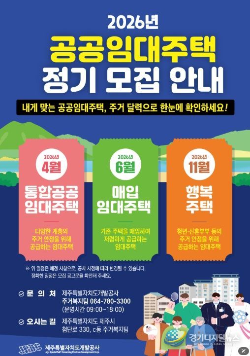 제주개발공사 관계자는 “정기 모집 체계 도입을 통해 도민의 정보 접근성과 편의성을 높이고, 보다 안정적인 주거 지원 기반을 마련할 것”이라며, “앞으로도 청년, 신혼부부 등 다양한 계층을 위한 맞춤형 주거복지 확대에 지속적으로 노력하겠다”고 밝혔다.