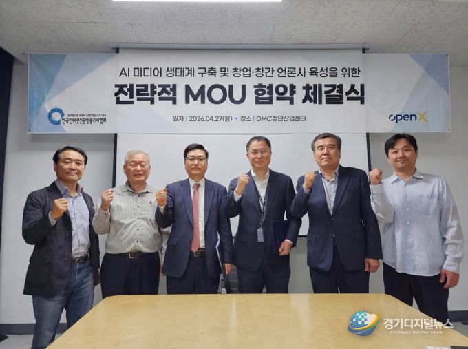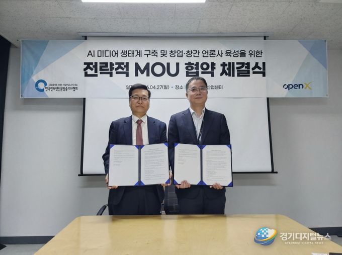 경기디지털뉴스 마성숙 기자 | 한국인터넷신문방송기자협회(회장 전병길, 이하 협회)와 오픈엑스(대표 김미진)는 지난 2026년 4월 27일 서울 상암동 DMC첨단산업센터에서 업무협약(MOU)을 체결하고, 제휴 언론사 육성과 건강한 미디어 생태계 강화를 위해 적극 협력하기로 뜻을 모았다.