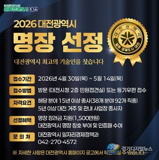 경기디지털뉴스 마성숙 기자 | 대전시는 4월 30일부터 5월 14일까지 지역 숙련기술인의 자긍심을 높이고 산업 발전에 기여할 ‘2026 대전광역시 명장’을 공개 모집한다.