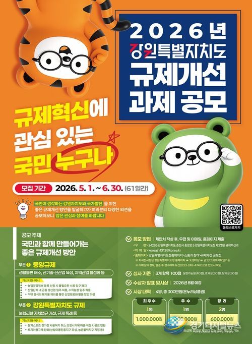 경기디지털뉴스 마성숙 기자 | 강원특별자치도는 국민과 함께 만들어가는 좋은 규제 개선을 주제로 2026. 5. 1.부터 6. 30.까지 전 국민을 대상으로 '2026년 강원특별자치도 규제개선 과제 공모'를 추진한다.