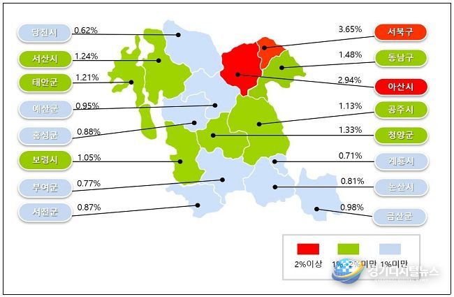 시군별 변동률은 천안시 서북구가 3.65%로 가장 높았고, 아산시가 2.94%로 뒤를 이었으며, 변동률이 가장 낮은 지역은 당진시 0.62%로 나타났다.