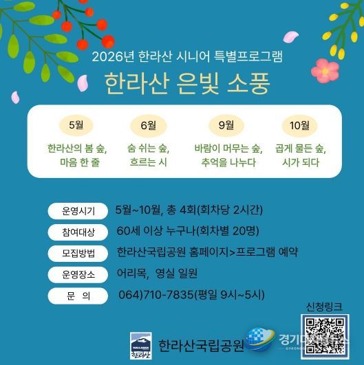 5월 프로그램 참가 신청은 한라산국립공원 누리집 ‘프로그램 예약'에서 4월 30일부터 5월 11일까지 회차별 20명씩 선착순으로 받는다.