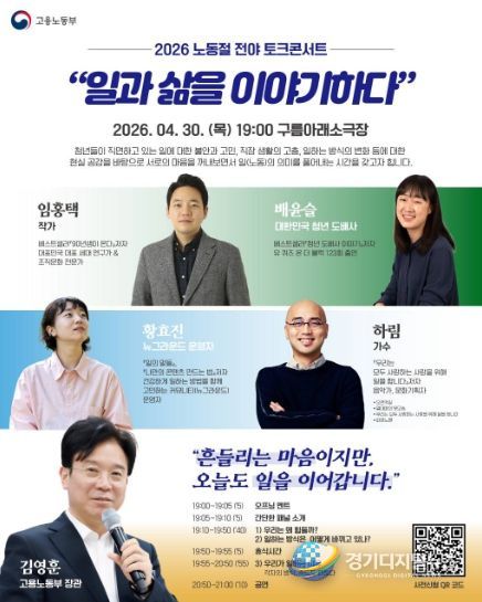 경기디지털뉴스 마성숙 기자 | 고용노동부는 4월 30일 저녁 7시, 서울 마포구 소재 ‘구름아래소극장’에서 청년 200여 명과 함께 일에 대한 고민을 나누며, 노동의 가치를 다시 한번 생각해 보는'일과 삶을 이야기하다' 토크콘서트를 개최했다고 밝혔다.