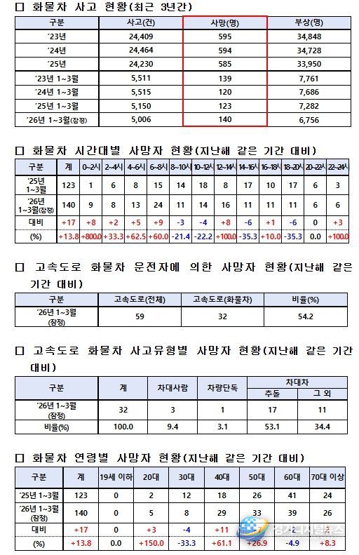 경찰청 교통사고 통계에 따르면 2026년 3월까지 발생한 화물차 사망사고(잠정)는 최근 3년 같은 기간 평균(1~3월) 발생한 사망자인 127.3명보다 9.9% 증가한 수준인 140명이 발생했다.