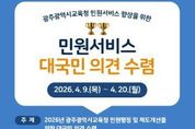 경기디지털뉴스 마성숙 기자 | 광주시교육청은 민원서비스 품질 향상을 위해 오는 9~20일 국민권익위원회 온라인 정책참여 플랫폼 ‘국민생각함’과 ‘시교육청 누리집’을 통해 대국민 의견을 수렴한다. 이번 의견 수렴은 국민의 다양한 목소리를 민원행정과 제도개선에 반영해 광주교육 민원서비스 만족도를 높이기 위해 추진됐다. 의견 수렴 내용은 ▲민원서비스 향상을 위한 제도 개선 ▲민원실 편의시설 및 환경 개선 ▲기타 민원서비스 이용 시 불편사항 및 개선 아이디어 등이다. 지난해 실시한 ‘2025년 민원서비스 개선 대국민 의견수렴’에는 595명의 국민이 참여해 다양한 의견을 제시했다. 시교육청은 올해도 다양한 의견을 듣기 위해 참여자 중 20명을 추첨해 모바일 음료 교환권을 증정하는 이벤트를 진행한다. 박준수 행정국장은 “시민 눈높이에 맞는 민원서비스를 제공하기 위해서는 현장 의견을 듣고 정책에 반영하는 것이 무엇보다 중요하다”며 “수요자 중심의 민원행정과 제도개선을 통해 신뢰받는 교육행정이 실현되도록 최선을 다하겠다”고 말했다.
