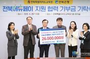 경기디지털뉴스 마성숙 기자 | 전북에듀페이카드 운영사인 전북은행이 전북특별자치도교육청에 장학금 2,600만 원을 기부했다. 전북교육청과 전북은행은 25일 본청 5층 회의실에서 전북에듀페이 지원 협력사업 기부금 기탁식을 개최했다. 전북은행은 이날 전북에듀페이카드 바우처 사용액의 0.1%에 해당하는 2,600만 원의 기부금을 학생 복지와 지역사회 공헌의 취지로 기탁했다. 지난해 2,000만 원을 기부한 전북은행은 내년까지 3년 동안 약 6,300만 원을 기부할 계획이다. 전북은행 기부금은 전북특별자치도교육청사랑의장학회를 통해 장학금으로 전달된다. 올해 초중고 학생과 학교 밖 청소년 등 총 16만3,000여 명에게 238억여 원의 전북에듀페이를 지원하기로 한 전북교육청은 이달 24일부터 다음 달 15일까지 집중신청 기간을 운영하고 있다. 김은호 전북은행 부행장은 “전북에듀페이카드 운영사로서 전북에듀페이를 매개로 나눔과 베풂의 학생 교육복지에 동참할 수 있어 뜻깊게 생각한다”고 밝혔다. 한긍수 정책국장은 “전북에듀페이가 단순한 지원금을 넘어 교육과 나눔이 공존하는 선