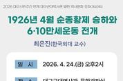 경기디지털뉴스 마성숙 기자 | 대구문화예술진흥원 박물관운영본부 소속 대구근대역사관은 2026년 대구시민주간 연계행사로 4월 24일 오후 2시에 ‘1926년 4월 순종황제 승하와 6·10만세운동 전개’를 주제로 전문가 특강을 개최한다. 올해 2월 말부터 대구문화예술진흥원 박물관운영본부 소속 대구시립 3개 박물관은 대구시민주간 연계행사로 ‘나라를 지킨 대구, 大邱 정신!’이란 주제로 전문가 특강과 시내 답사, 장거리 답사, 문화공연, 체험학습 등 다채로운 프로그램으로 시민들과 의미 있게 만나고 있다. 대구근대역사관은 ‘대구 독립운동 알기’ 주제 마지막 강연으로, 올해 100주년을 맞는 6․10만세운동을 재조명하는 ‘1926년 4월 순종황제의 승하와 6․10만세운동 전개’를 마련했다. 순종 승하일인 4월 25일에 맞추어 강의 날짜를 정했으며, 강의에서는 순종 장례 전개 과정을 살펴보고 인산일(因山日)에 일어난 6․10만세운동 흐름과 의미를 짚어본다. 특히 대구 독립운동사에서 크게 주목받지 못한 6·10만세운동 전개 과정에서 대구·경북 사람들의 활동에 대해 알 수 있는 좋은 기회가 될 것으로 기대하고