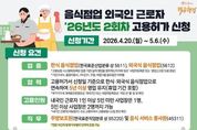 경기디지털뉴스 마성숙 기자 | 음식점업 외국인 근로자 '26년도 2회차 고용허가 신청 ■ 신청기간: 2026.4.20.(월)~5.6.(수) ■ 신청 요건 · 업종 한식 음식점업(한국표준산업분류 상 5611), 외국식 음식점업(5612) *고용보험 시스템에 등록된 업종 기준(실제 영업을 영위하는지 여부 등은 '사업자등록증' 또는 '영업신고증'으로 증빙) *기관구내식, 출장이동식, 기타간이, 주점, 비알코올 음료점은 미허용 · 업력 고용허가서 신청일 기준으로 한식·외국식 음식점업으로 연속하여 5년 이상 영업 유지(휴업 기간 포함) *부가가치세 과세표준증명원상 과세기간 또는 사업자등록증상 '개업년·월·일'로 확인 · 고용인원 내국인 근로자 1인 이상 5인 미만 사업장은 1명, 5인 이상 사업장은 2명까지 가능 *내국인근로자(피보험자) 수는 고용부에서 고용보험시스템 전산 확인 · 직무 주방보조원(한국표준직업분류 상 95220) 및 음식 서비스 종사원(45311) *현장 여건에 맞게 직무범위 탄력적 운영 가능 · 문의 - 고용노동부 상담센터 ☎1350 · 신청 - 사업장