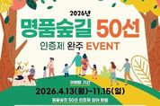 경기디지털뉴스 마성숙 기자 | 산림청은 숲길을 활용한 국민의 여가 활성화 및 지역경제 활성화를 위해 ‘2026년 명품숲길 50선 완주 인증제’를 11월 15일까지 운영한다고 13일 밝혔다. ‘명품숲길 50선 완주 인증제’는 2025년 첫 도입 이후 국민의 높은 관심과 참여로 총 23명의 완주자를 기록했으며, 올해는 2년 차를 맞아 참여 기회를 확대하고 이용 편의성을 개선했다. 이번 인증제는 스마트폰 앱 ‘모바일 스탬프 투어’를 활용한 GPS기반 온라인 인증과 숲길 현장 스탬프를 활용한 오프라인 인증 방식을 병행해 누구나 쉽게 참여할 수 있도록 운영한다. 참여자가 50개소를 모두 완주하면 앱을 통해 전자 인증서가 자동으로 발급되며, 실물 인증서는 모바일 앱을 통해 별도로 신청할 수 있다. 전국 50개 명품숲길을 모두 완주할 경우 산림청장 명의의 완주 인증서와 기념품이 제공된다. 앱 설치 방법 등 인증제에 대한 자세한 사항은 산림청과 숲나들e 누리집을 통해 확인할 수 있다. 조영희 산림청 산림복지국장은 “명품숲길 완주 인증제는 국민이 숲길을 보다 적극적으로 경험하고 가까워지는 계기이다.”며