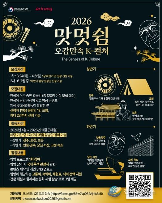 경기디지털뉴스 마성숙 기자 | 문화체육관광부는 국제방송교류재단과 함께 한국의 다채로운 매력을 세계에 알리는 ‘2026 맛·멋·쉼 오감만족 케이-컬처’ 사업을 추진한다. 이 사업에서 주한 외국인 콘텐츠 창작자(인플루언서) 120여 명은 한국의 맛·멋·쉼을 경험하고 이를 누리소통망(SNS) 콘텐츠로 제작해 세계에 알린다.