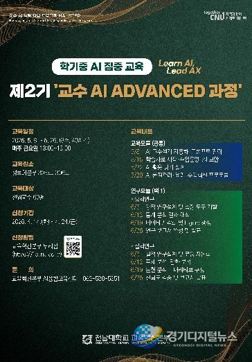 경기디지털뉴스 마성숙 기자 | 전남대학교 교육혁신본부는 전임교원의 AI 활용 교수설계 및 연구 역량 강화를 위한 ‘제2기 교수 AI ADVANCED 과정’을 학기 중 운영한다.